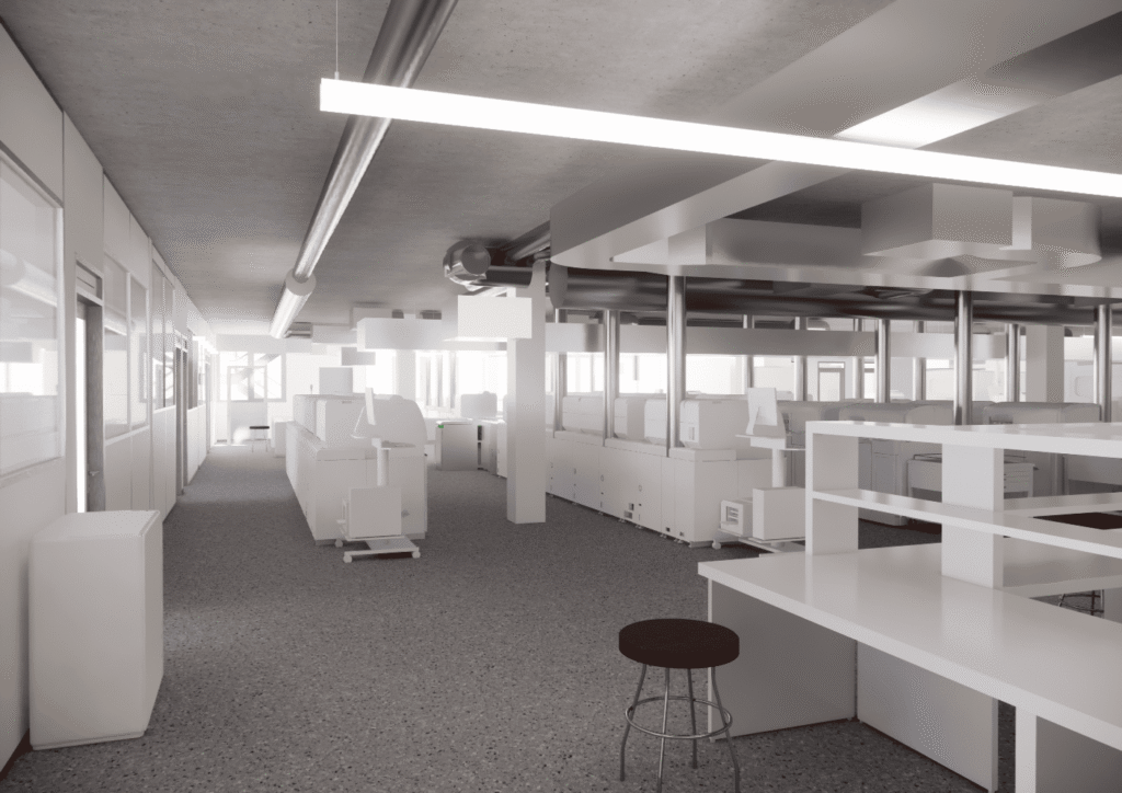 The spaces were designed to optimize workflow, increase analysis capacity, integrate state-of-the-art equipment, and ensure optimal comfort for staff and patients, while complying with current standards and heritage constraints. The work was planned in several stages to maintain laboratory activity during the renovation