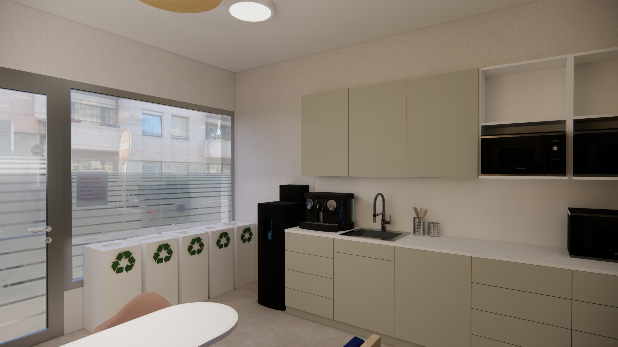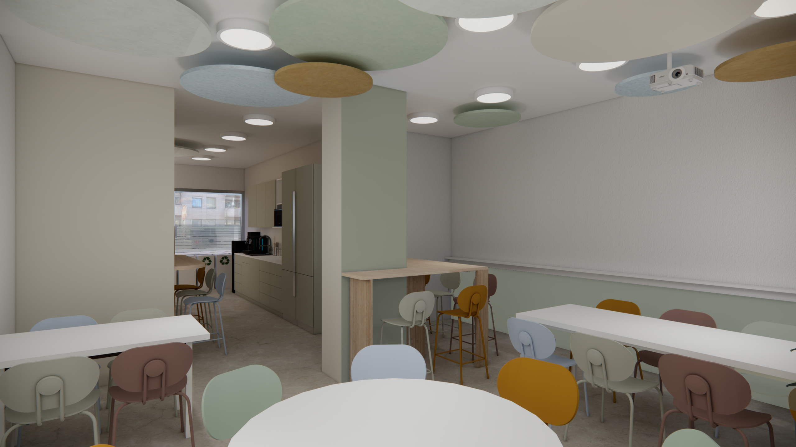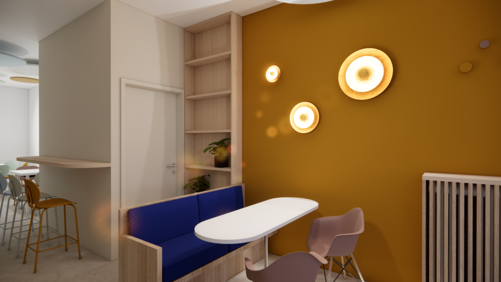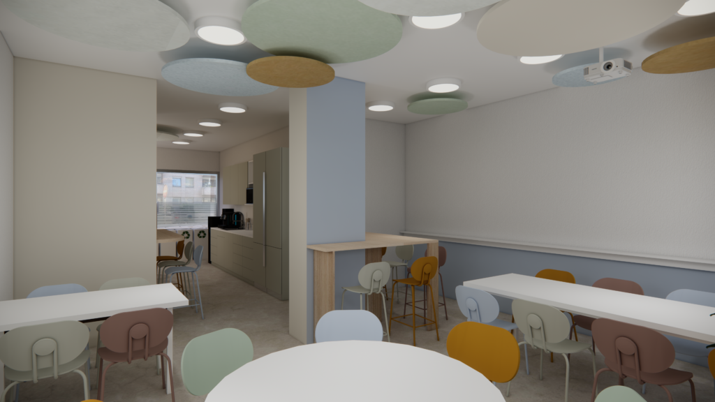 The layout was designed to create a pleasant and functional relaxation area, conducive to breaks and socializing among colleagues.